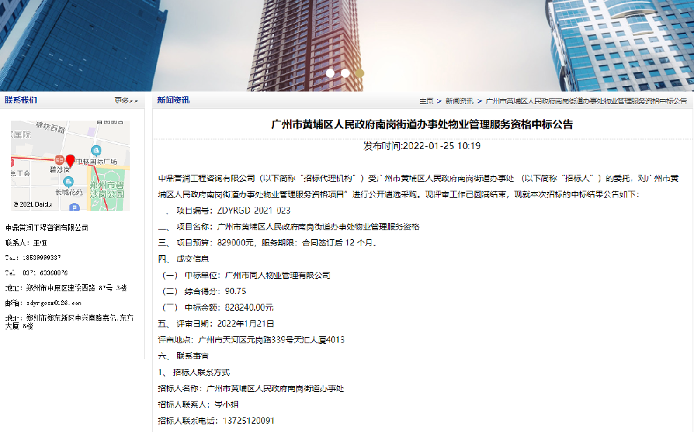 鼎點(diǎn)娛樂工程咨詢有限公司(以下簡稱“招標(biāo)代理機(jī)構(gòu)”)受廣州市黃埔區(qū)人民政府南崗街道辦事處 (以下簡稱“招標(biāo)人”)的委托,對廣州市黃埔區(qū)人民政府南崗街道辦事處物業(yè)管理服務(wù)資格項(xiàng)目”進(jìn)行公開遴選采購。現(xiàn)評審工作已圓滿結(jié)束,現(xiàn)就本次招標(biāo)的中標(biāo)結(jié)果公告如下:一、項(xiàng)目編號(hào):ZDYRGD-2021-023二、項(xiàng)目名[詳細(xì)]